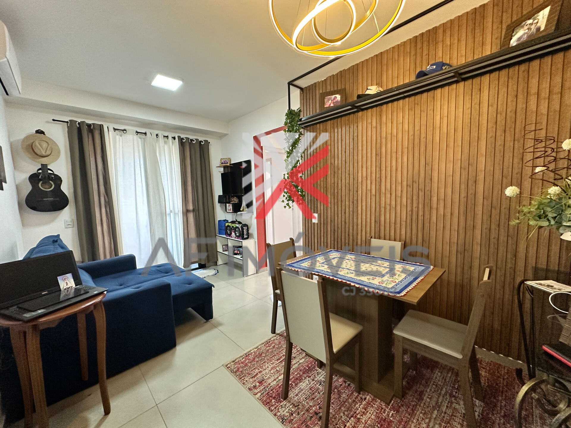 A cozinha americana equipada com armários e cooktop se conecta perfeitamente com a sala de jantar e TV, criando um ambiente ideal para receber amigos e família. O imóvel ainda conta com ar-condicionado, piso em porcelanato e um elegante painel ripado na sala.